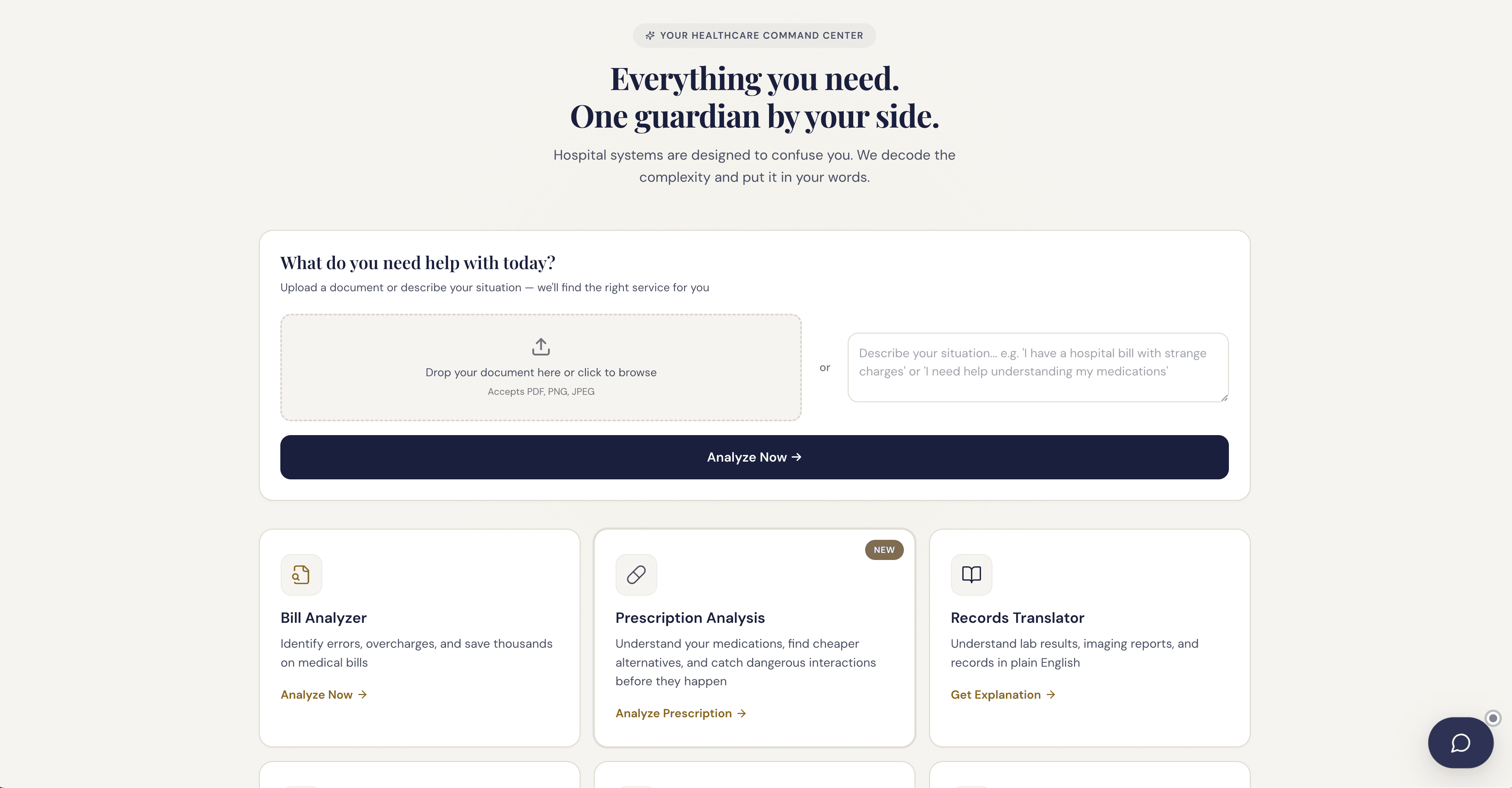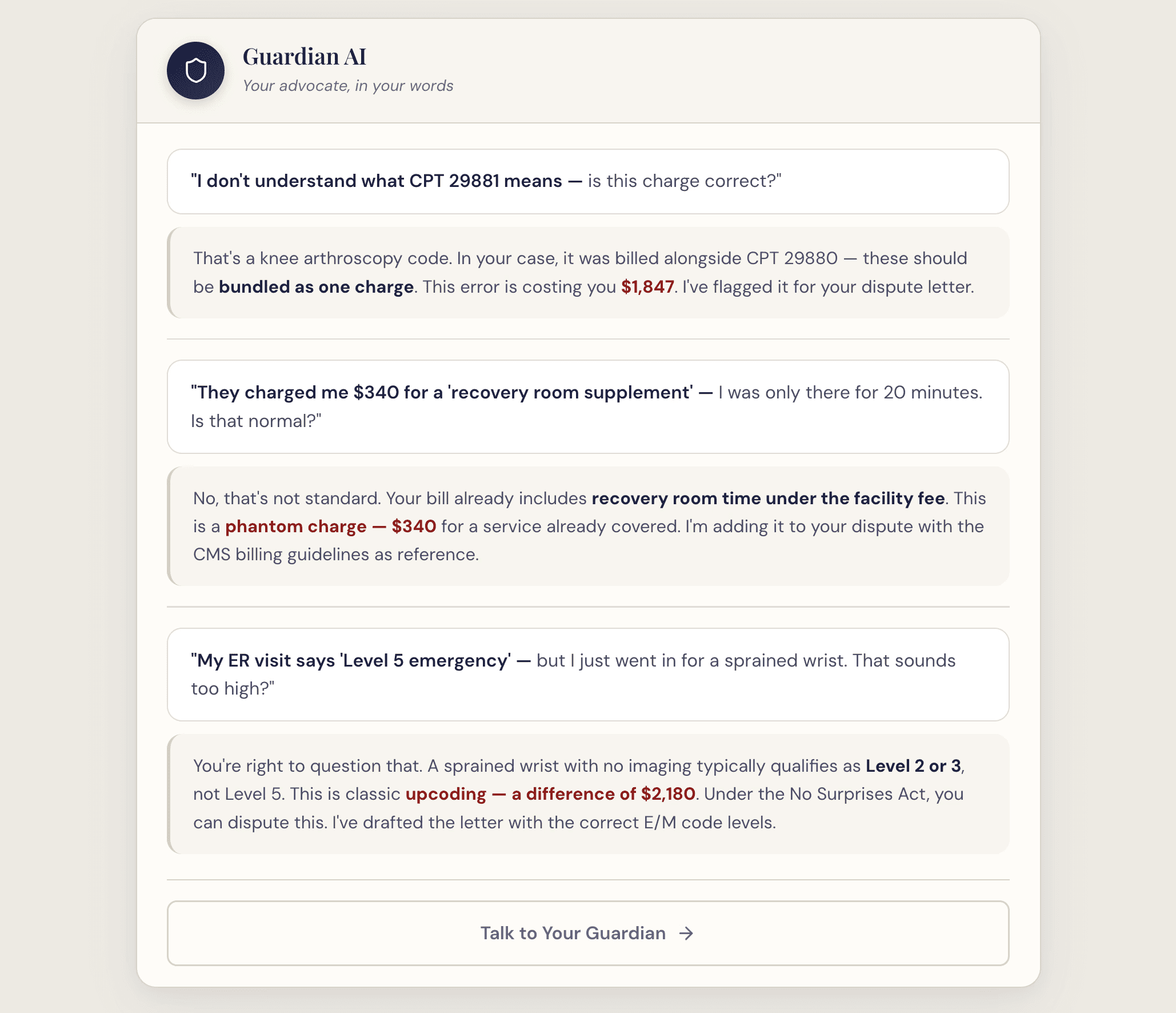The 7 services cover the full patient journey: understanding a bill, decoding insurance benefits, preparing for a visit, translating records, analyzing prescriptions, navigating prior authorization, and getting a second opinion. Guardian AI sits across all of them as a conversational layer.