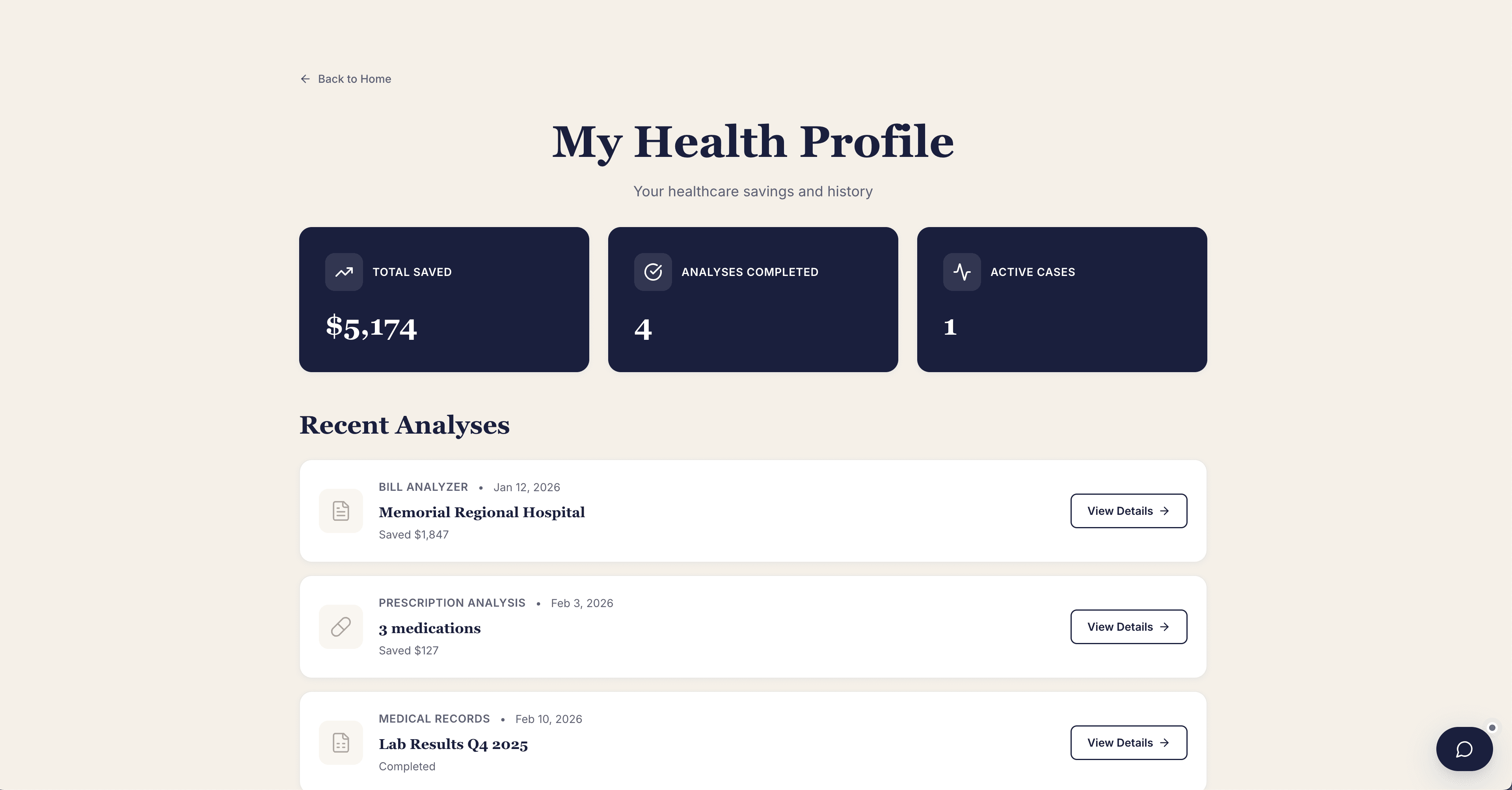 Four analyses, $5,174 saved. The health dashboard tracks cumulative savings across every service used.