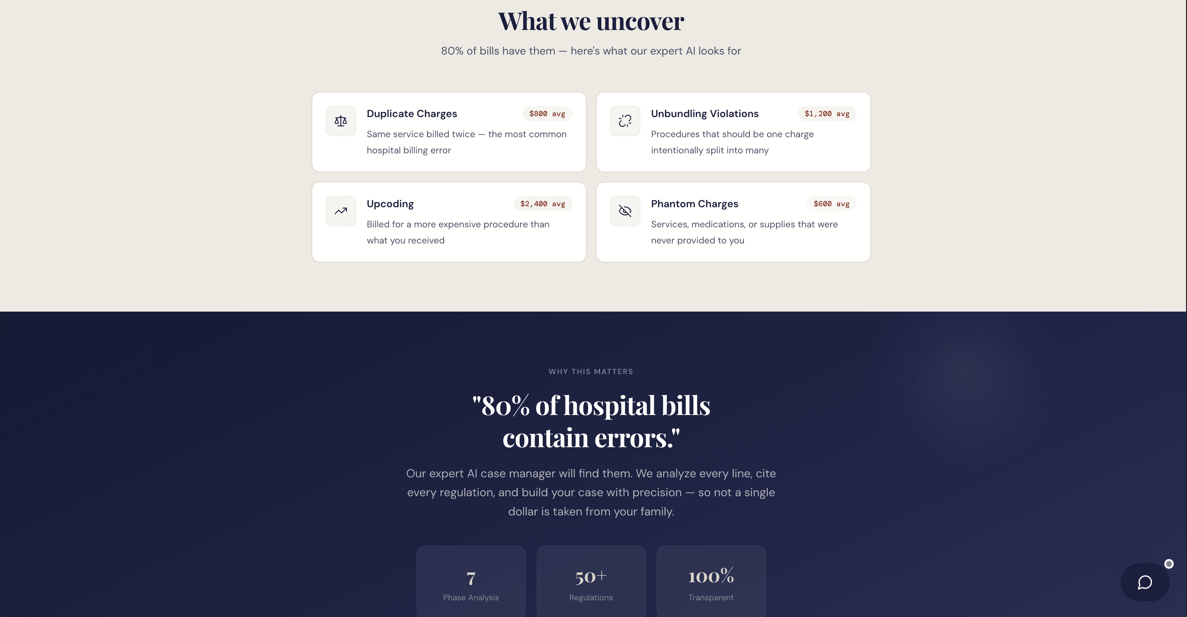 Duplicate charges, unbundling violations, upcoding, phantom charges. The four most common hospital billing errors — averaging $800 to $2,400 each.
