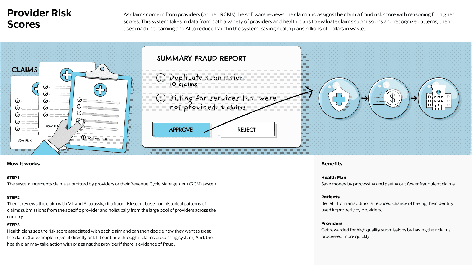 Fraud detection system assigning risk scores, saving billions.